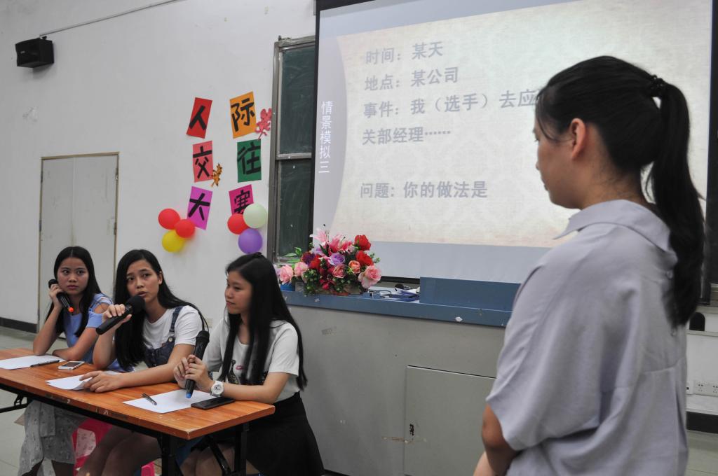 比赛最后,梁银雄老师上台致辞。他说:“我们每个人对于长辈、领导,要懂得“吃亏”;对于晚辈、下属,要懂得“包容”;对于自己,则要懂得‘责任’。只有这样,我们才能更好的处理好我们的人际关系!”最后,他还对在这炎炎夏日到场的各位嘉宾老师、表演人员、工作人员以及在座的每位同学表示深深的感谢。在阵阵掌声中,第二届人际交往大赛决赛圆满结束。