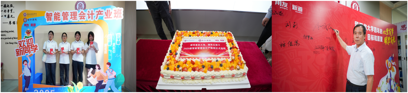 暖场环节为2025级智能管理会计产教班新生精心准备了欢迎仪式与专属礼品:迎新文化签到墙、特色打卡拍照点、定制蛋糕、产业班班服以及趣味互动活动,现场氛围热烈,新生们满怀期待开启大学新篇章。