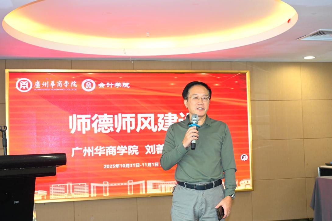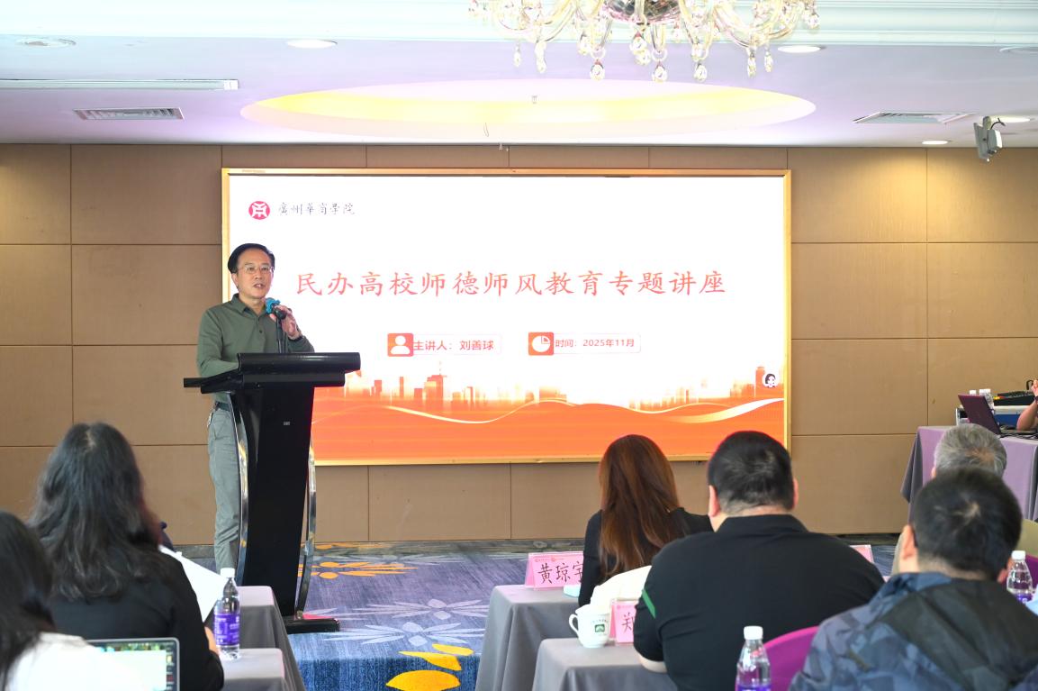 在专题讲座环节,刘善球书记以《民办高校师德师风教育专题》为题进行深入讲解。他强调,民办高校的师德师风建设是坚守教育初心、赢得社会信任、适配应用型人才培养的核心保障。他系统阐释了以“爱岗敬业、关爱学生、教书育人、为人师表、终身学习”为核心的师德内涵体系,并针对当前存在的师资结构多元、监管机制薄弱等现实挑战,提出了从制度保障、教育引导、监督约束到激励赋能的系统性建设路径,为民办高校落实立德树人根本任务提供了实践指引。