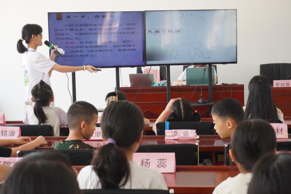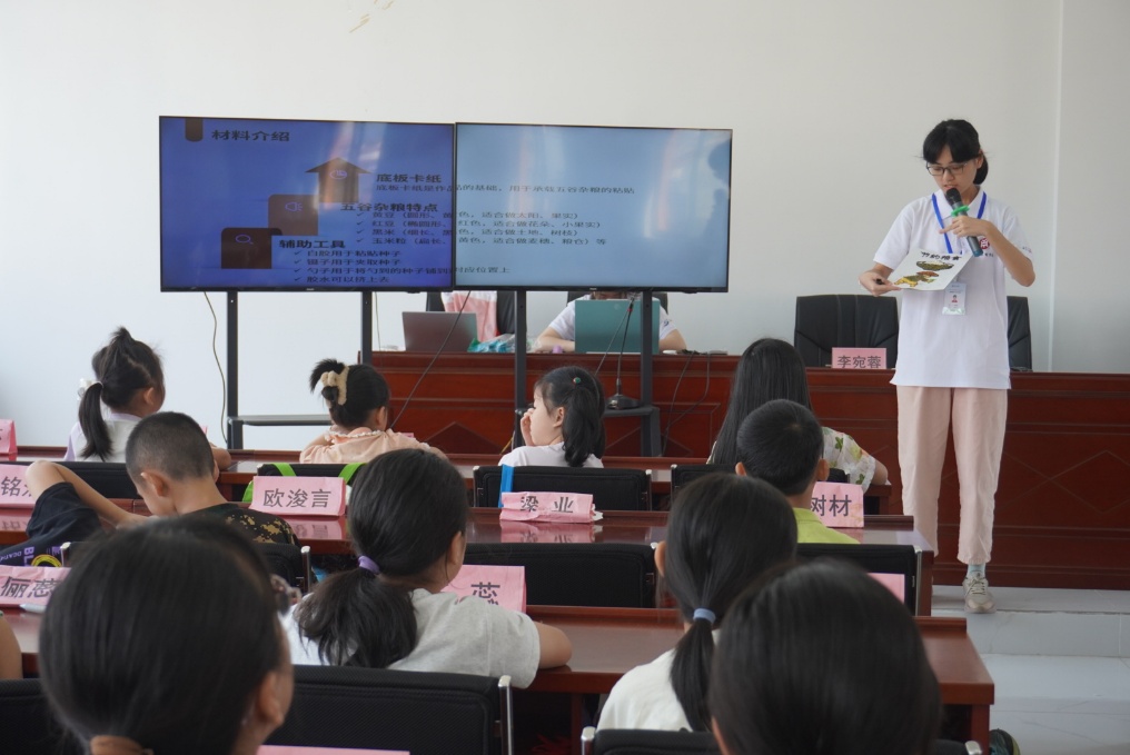 禾黍盈香入画屏,“五谷艺术绘”课程伴着晨光悄然启幕,实践团成员轻触屏幕上灵动的农作物图案,带领孩子们开启一场奇妙的辨识之旅。玉米的饱满、大豆的圆润、高粱的红穗……孩子们目光灼灼,小手指点间,稚嫩的童声如雀跃的音符此起彼伏,将课堂织成一片热闹的海洋。当话题转向一粒米的成长之旅,课堂稍静,孩子们蹙眉沉思,窃窃私语,探讨着粮食从田间到餐桌的脉络——这背后,是农人汗水的浇灌,亦是国家沃土的滋养。