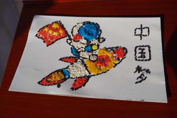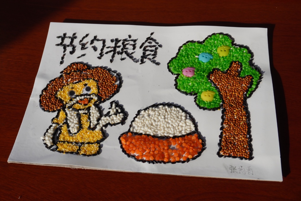 粒米之中藏乾坤,孩子们听着“一粟一饭,心系家国”的讲述,边将种子仔细粘贴,五彩谷物在掌心流转:有的在画中勾勒出金黄的田野,在其中嵌入鲜红的五角星;有的用不同谷物拼出祖国版图轮廓,颜色各异的种子如斑斓星火,栖满在这片承载着希望的土地。当遇难题时相互帮助,协作精神悄然萌芽。每幅作品,不仅有对节约粮食的领悟,更藏着孩子们对土地的热爱、对家国的赤诚——颗颗种子粘起的,是对劳动的尊重,更是对“爱党爱国”最纯真的诠释。