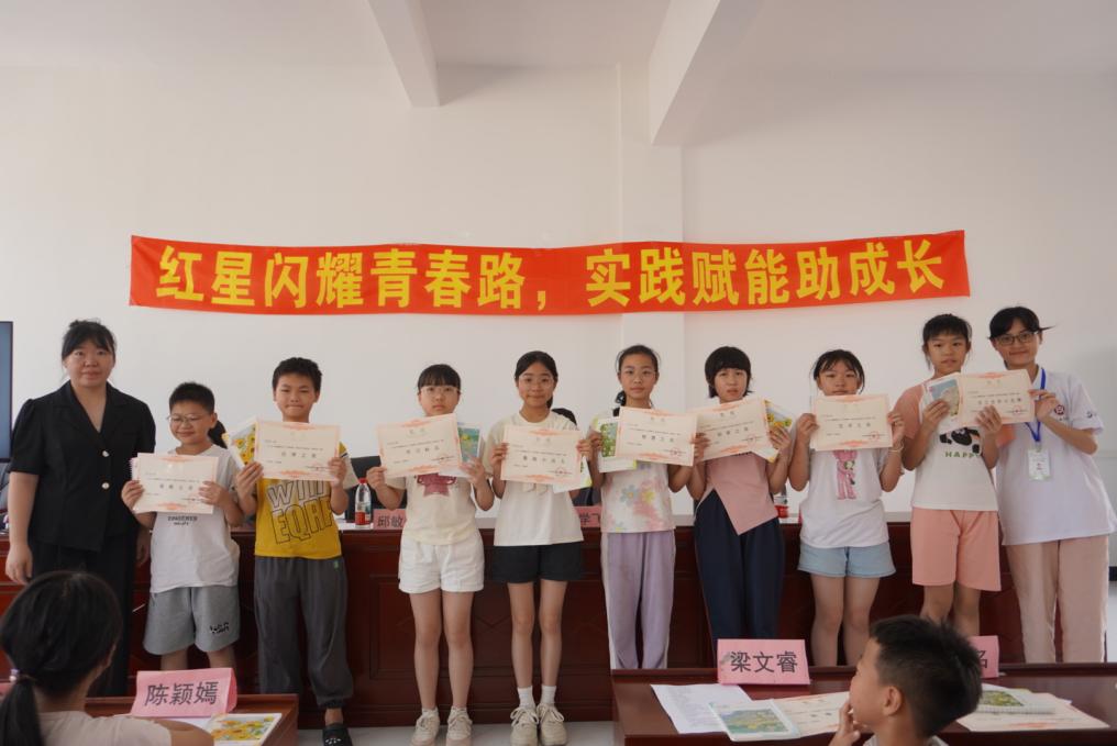 紧接着,陈学飞委员、红星社区党总支部委员兼妇女主任邱敏贞及实践团队长李宛蓉一同为小营员们颁发了“小小书法家”“扎染小能手”等奖项。这一张张奖状,既是对孩子们七天里专注学习、积极探索的肯定,更呼应着国家对青少年“德智体美劳全面发展”的成长要求。其中藏着国家“培养能够担当民族复兴大任的时代新人”的殷切期许,也见证着青少年在实践中涵养精神、锤炼本领的成长轨迹。